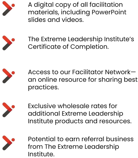 At the end of this intensive, 4-day program, you’ll be licensed to offer the powerful Extreme Leadership Workshop to your clients, your company, your team, your colleagues, or your community; just as important, you’ll become part of The Extreme Leadership Institute community and our exclusive facilitator “tribe.”